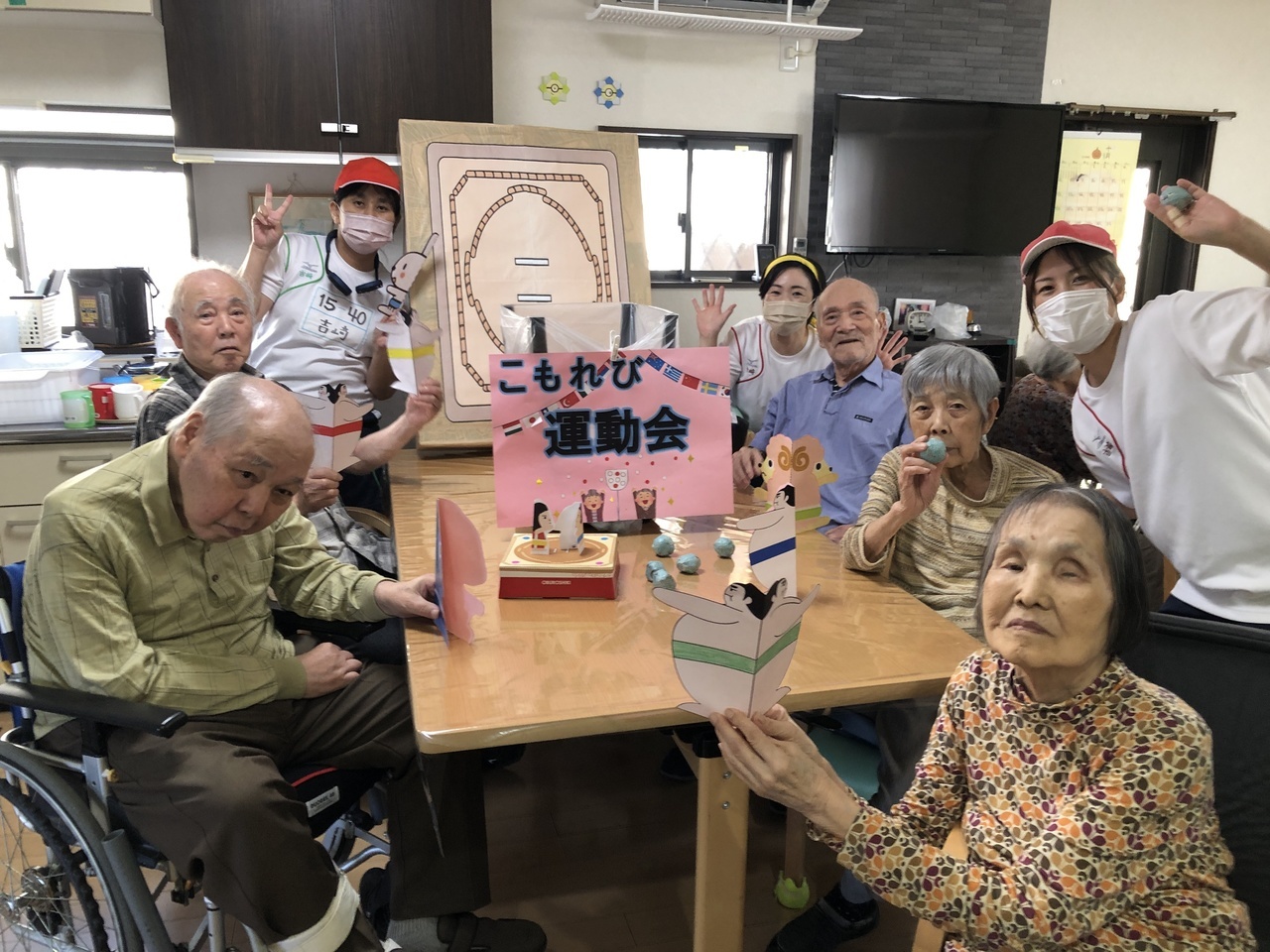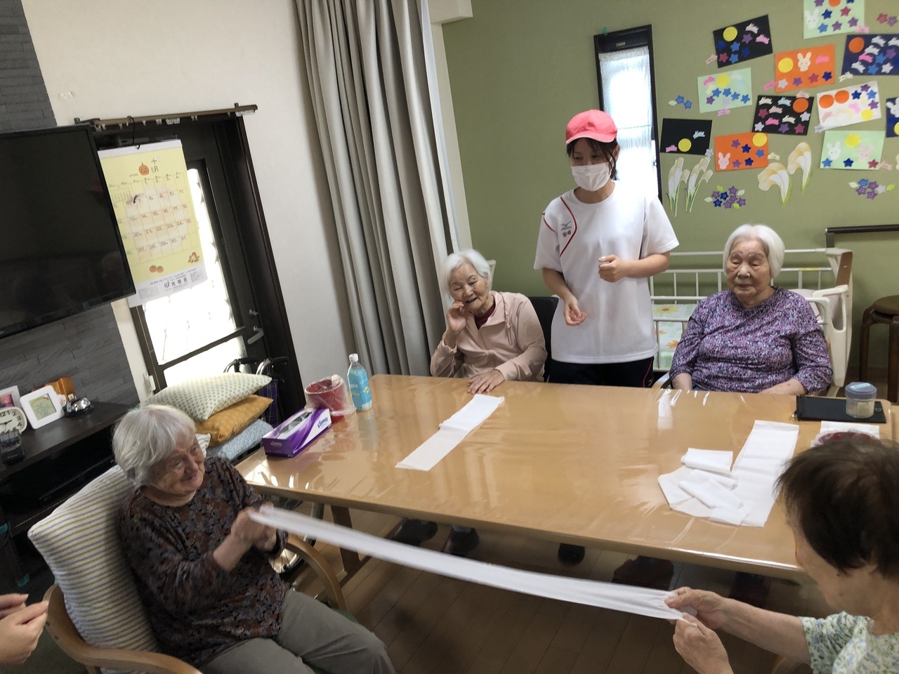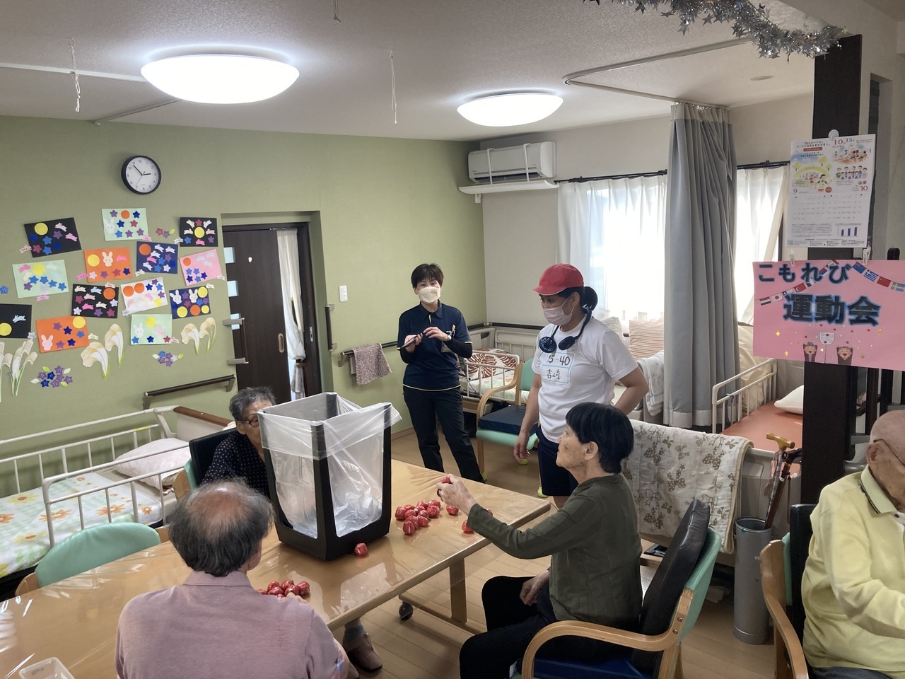 10月は運動会を開催しました。紙相撲、トイレットペーパー引き、玉入れなど懐かしんで参加されました。