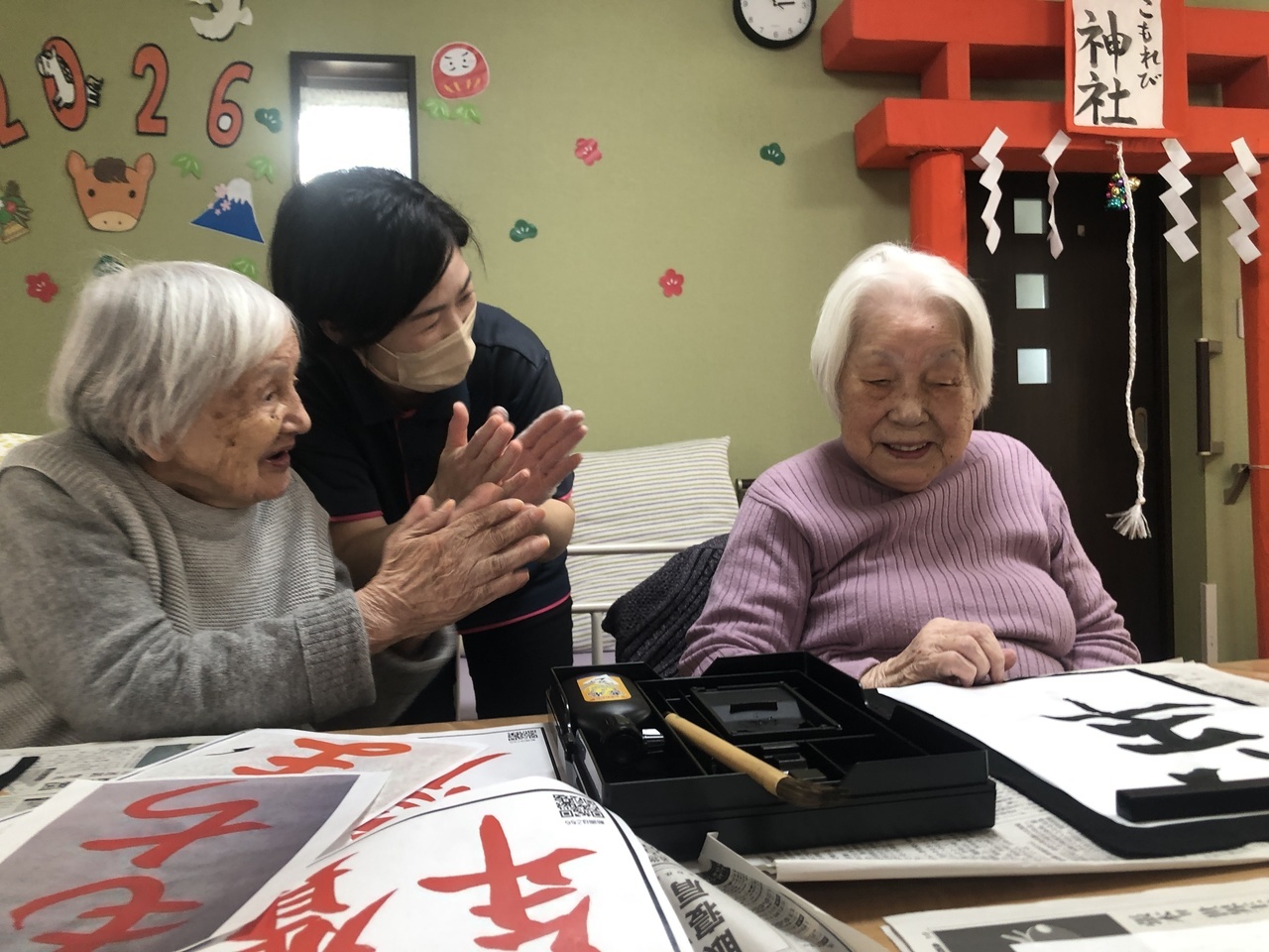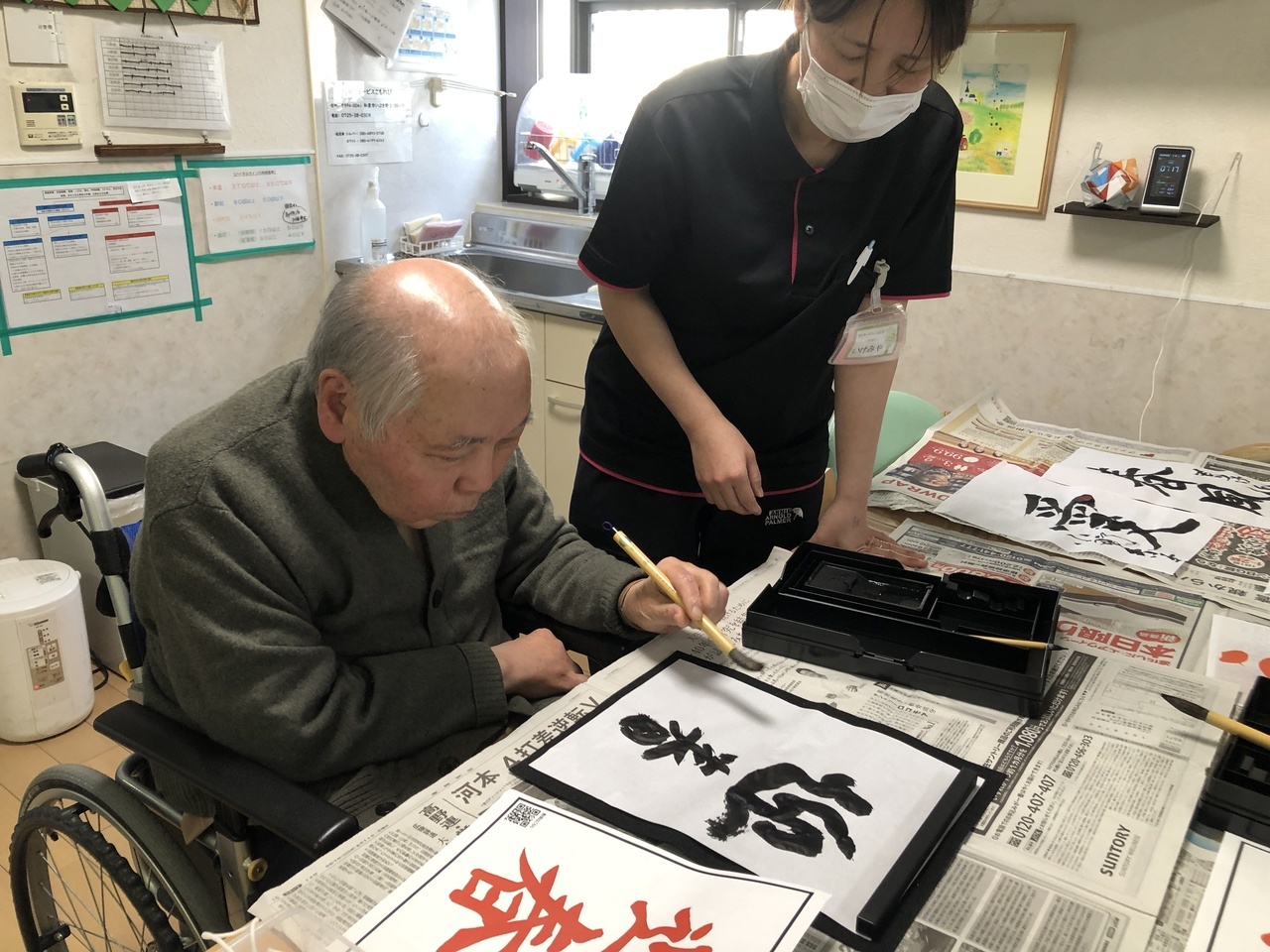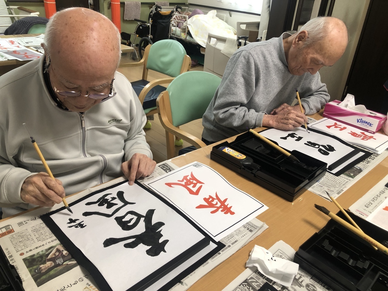 今年最初の行事は書初め大会でした。筆を持つのが久しぶりな方ばかりで最初は戸惑っている姿が見られましたが、書き始めるとスラスラと筆を進めておられました。楽しかった!また来年もしてほしい!という声も聞くことができました。