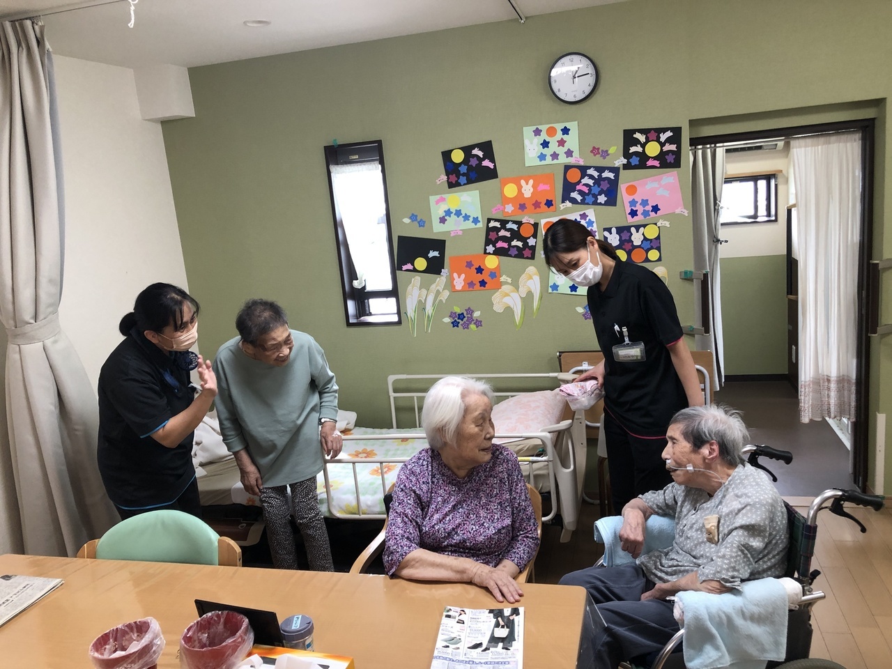毎月、翌月の季節の壁画を制作しています。折り紙や絵の具、画用紙などを用いて制作します。15時半からは脳のトレーニングをとりいれたレクリエーションを行い、歌や体を動かすゲーム、クイズ等で楽しんで頂いています。