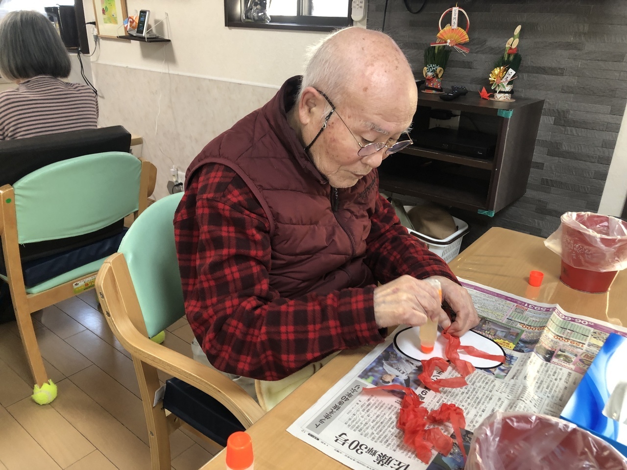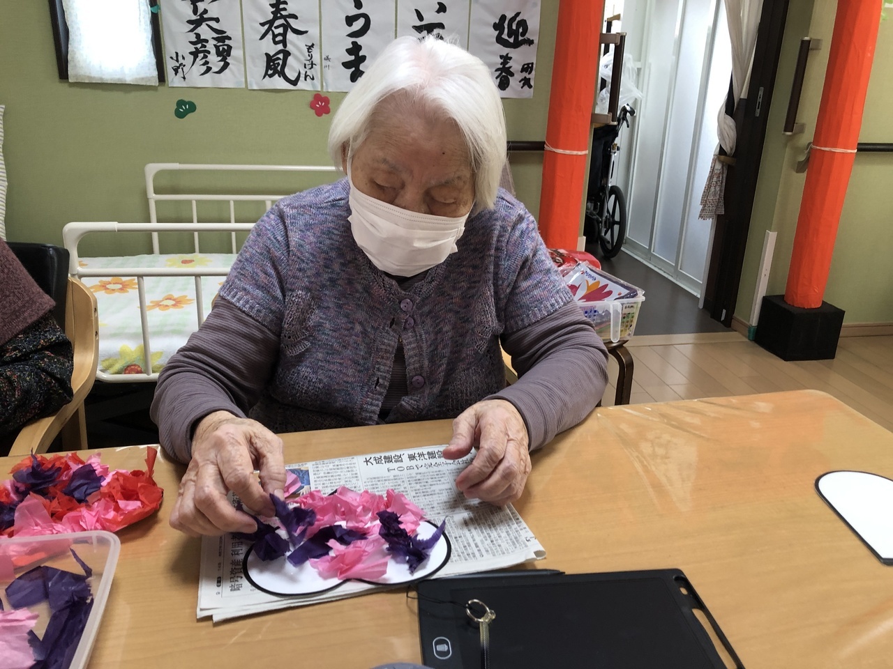 毎月、こもれびのフロアの壁面を彩る制作ですが、ご利用者様に制作活動を行って頂いています。季節を感じたり、手先を動かすことを目的に取り組んでいます。
