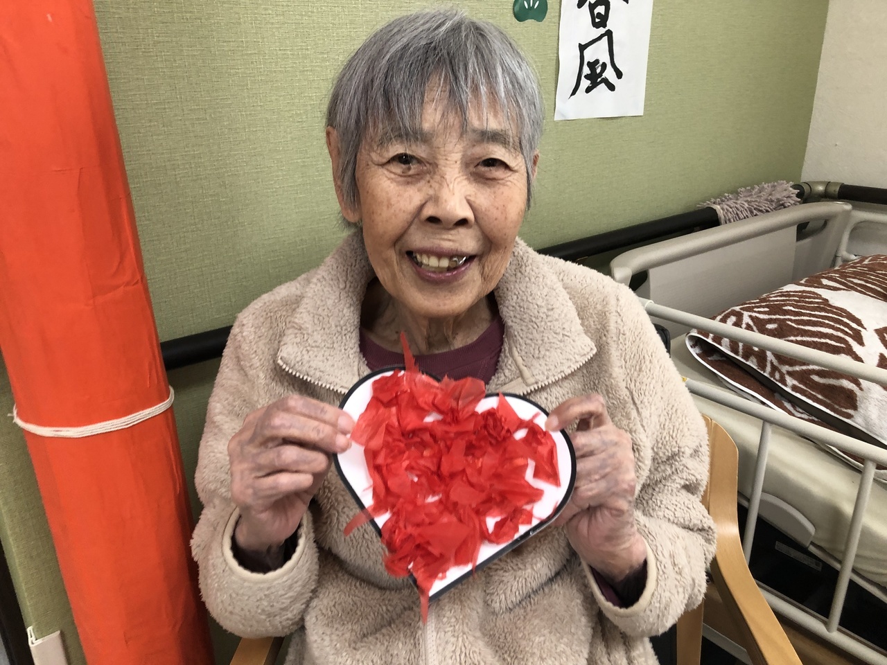 今月はバレンタインの制作をしていただきました。ハート形にお花紙を貼っていきます。たくさんの立体的で可愛いハートがこもれびの壁を彩っています。
